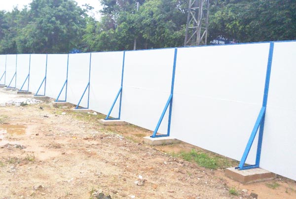 施工圍擋用白色彩鋼板作墻體,用藍(lán)色雙拼C型鋼作立柱,立柱頂部配藍(lán)色造型端蓋(可裝路燈),圍墻四周用藍(lán)色彩鋼框邊。高矮、大小、色澤一致。臟污后隨時(shí)可用水清洗擦拭。